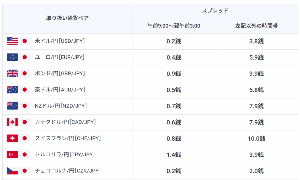 午前9:00〜翌午前3:00の時間帯を「原則固定スプレッド」としており、それ以外の時間帯では一気にスプレッドが拡大します。