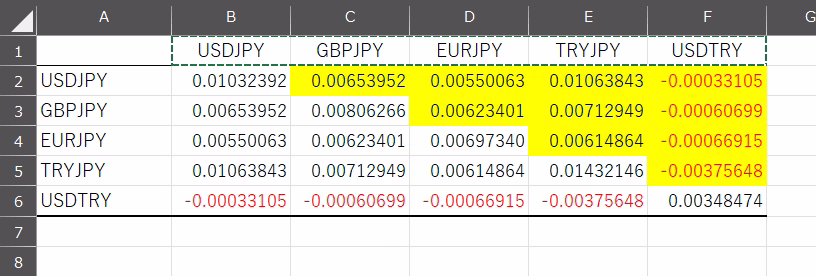 すると、縦横に通貨ペアが並んだ共分散行列が出力されます。
