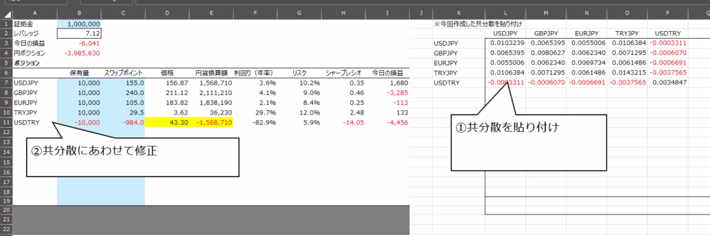 多通貨スワップ戦略で使っているエクセルファイルは、基本的には中身が見える構造ですが、共分散行列だけは筆者が更新しているため、自分では修正しにくい部分でした。