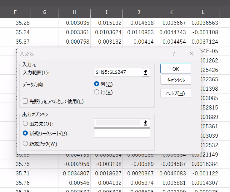 3つ目は、エクセルの標準機能で共分散を作成する。