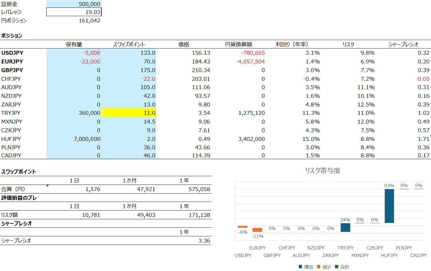 証拠金を倍にすると、ハンガリーフォリント円(HUF/JPY)とトルコリラ円(TRY/JPY)が上限に達するため、残余のリスク・収益配分は他通貨ペアでバランスを取ることが重要になります。