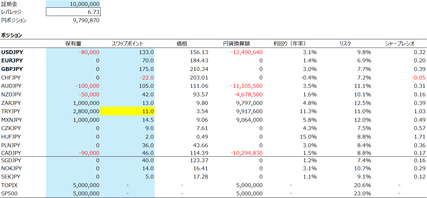 🔹 多通貨スワップ戦略にトルコリラ導入!エクセルファイルを使ったポジションの決め方も解説