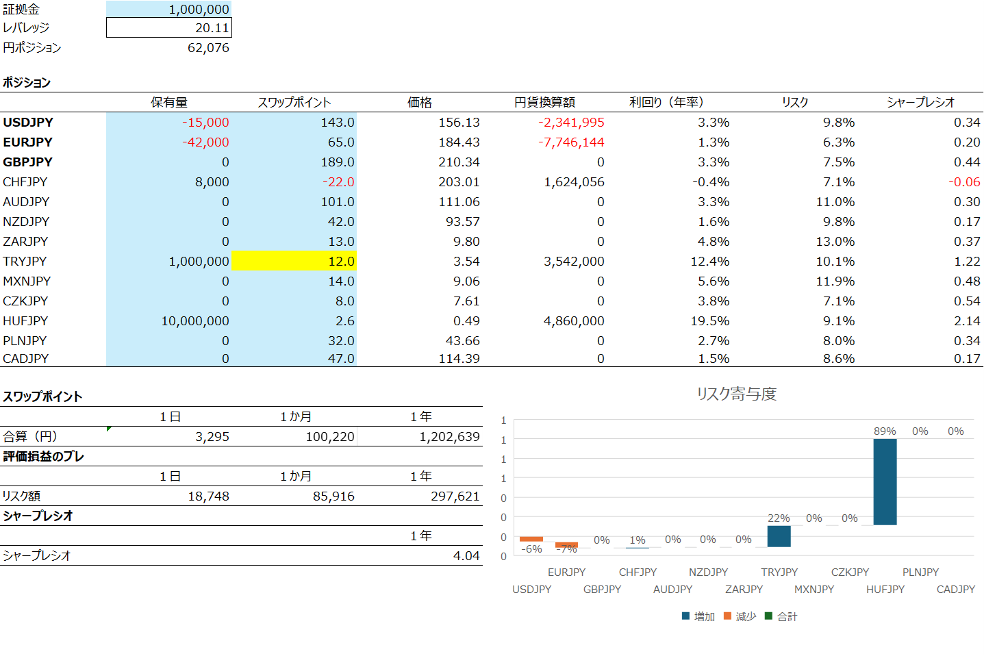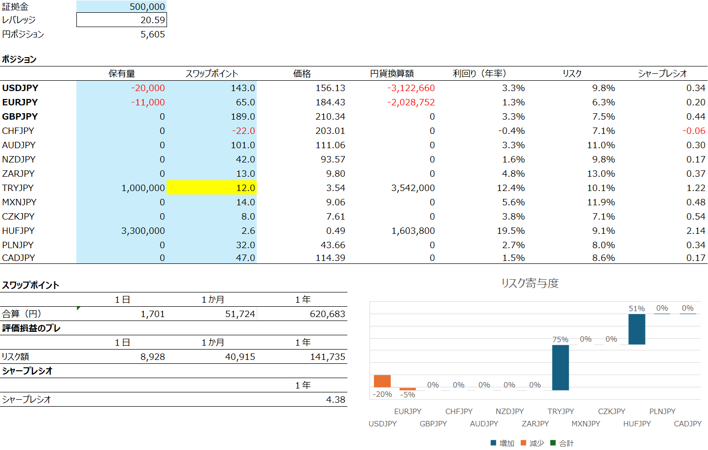 証拠金を倍にすると、ハンガリーフォリント円(HUF/JPY)とトルコリラ円(TRY/JPY)が上限に達するため、残余のリスク・収益配分は他通貨ペアでバランスを取ることが重要になります。