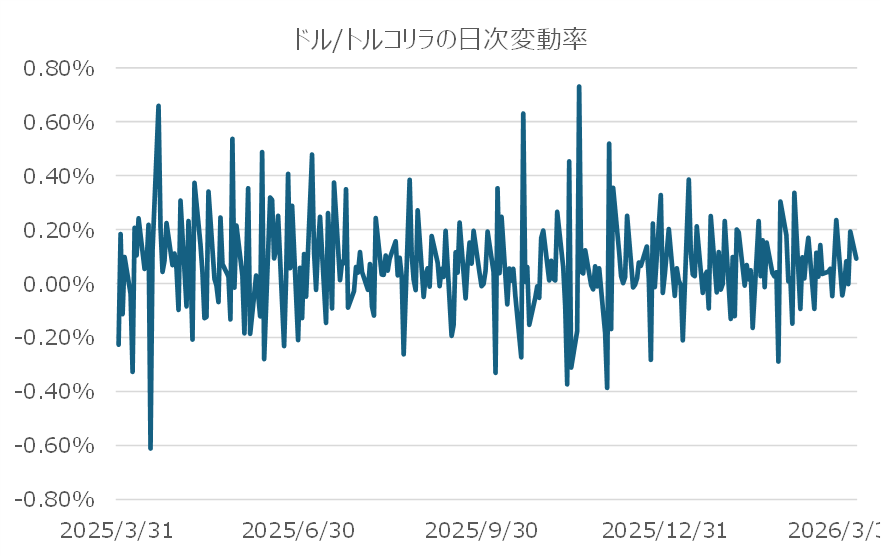過去1年間のドル/トルコリラの日次変動率を見ると、1日で最大0.7%上昇した日がありました。