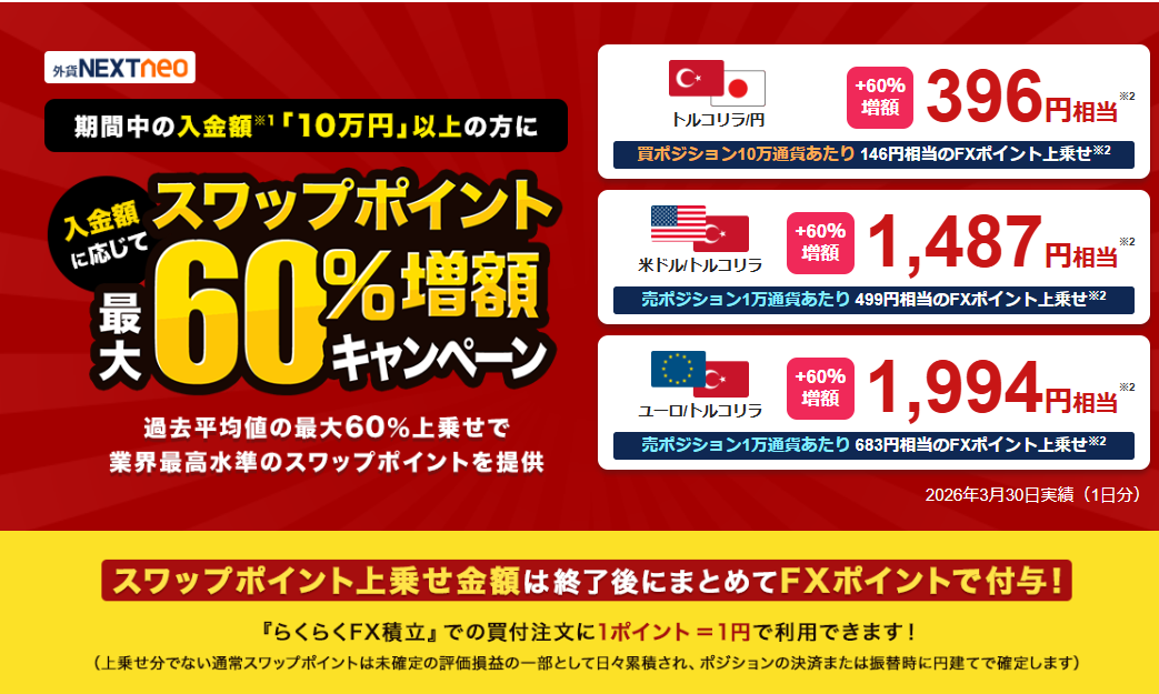 直近(2026年4月)の条件では、100万円以上の入金を行った場合、ドル/トルコリラの売りスワップに対して最大60%程度の上乗せ(今回なら1万通貨当たり499円)が行われています。
