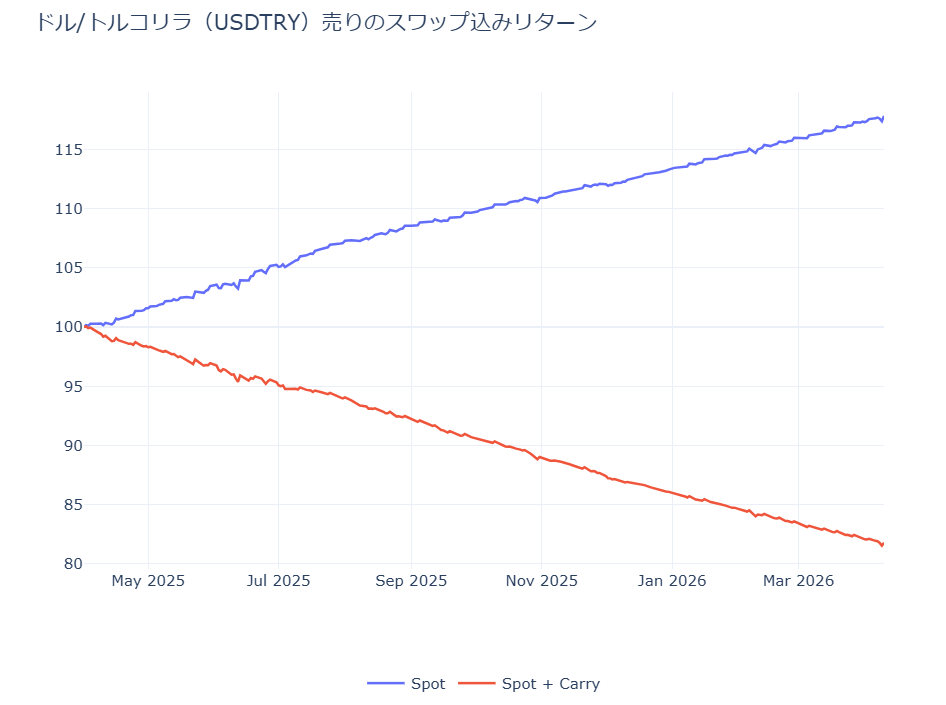特に、ドル/トルコリラのように金利差が大きい通貨ペアでは、スワップ収益がパフォーマンスの大部分を占めるため、スワップ水準の違いは長期的なリターンに大きな影響を与えます。